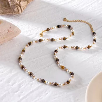 18K Gold Plated Tiger Eye & Imitation Shell Bead Necklace